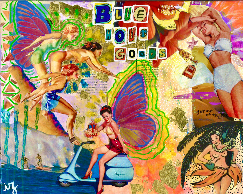 This collage was created in the early days of Blue Hour Goods, during the brand’s genesis in Santa Barbara at the height of the pandemic. At its heart is a girl on a baby blue Vespa, riding boldly into a vivid dreamscape. She symbolizes Maria, Blue Hour’s founder, and her journey to build something rooted in healing, self-expression, and connection (which all began on her baby blue vespa). A reflection of transformation and movement, the piece captures the energy and emotion of that fertile, uncertain time—when creativity became a lifeline and nature a sanctuary.